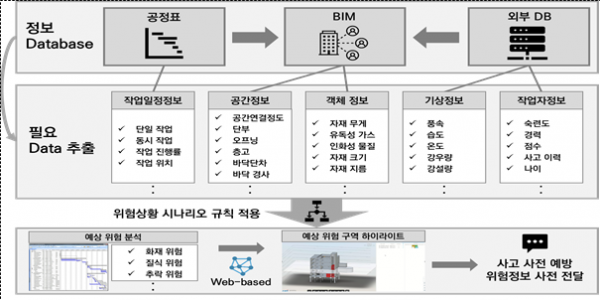 - - 공정표(작업정보)와 외부 DB(기상청 정보 등)를 BIM에 적용하고, 위험성 변화 추정 알고리즘을 활용하여 예상 위험요인과 위험 구역 정보를 제공