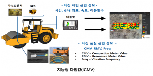 - 본 기술은 성토공사에 사용되는 진동롤러에 가속도계 및 GPS 센서 등을 설치하고, 해당 센서로부터 계측되는 데이터를 이용하여 실시간 다짐도를 측정하는 기술임