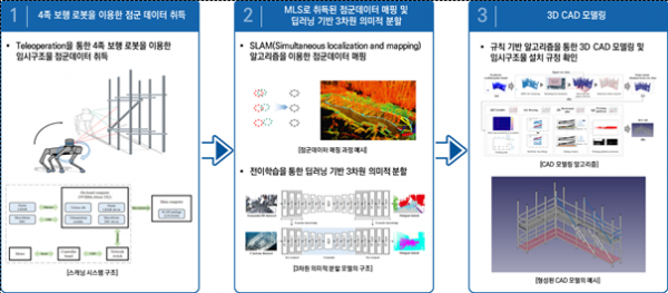 - 로봇은 LiDAR 센서를 사용하여 임시 구조물의 데이터를 수집하고, 이를 기반으로 3D 모델을 생성